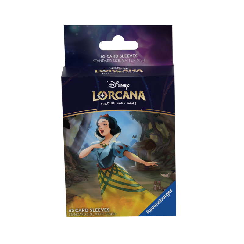 Each pack contains 65 matte-finish card sleeves featuring a Disney Lorcana TCG glimmer. The characters featured will be Snow White and Genie.