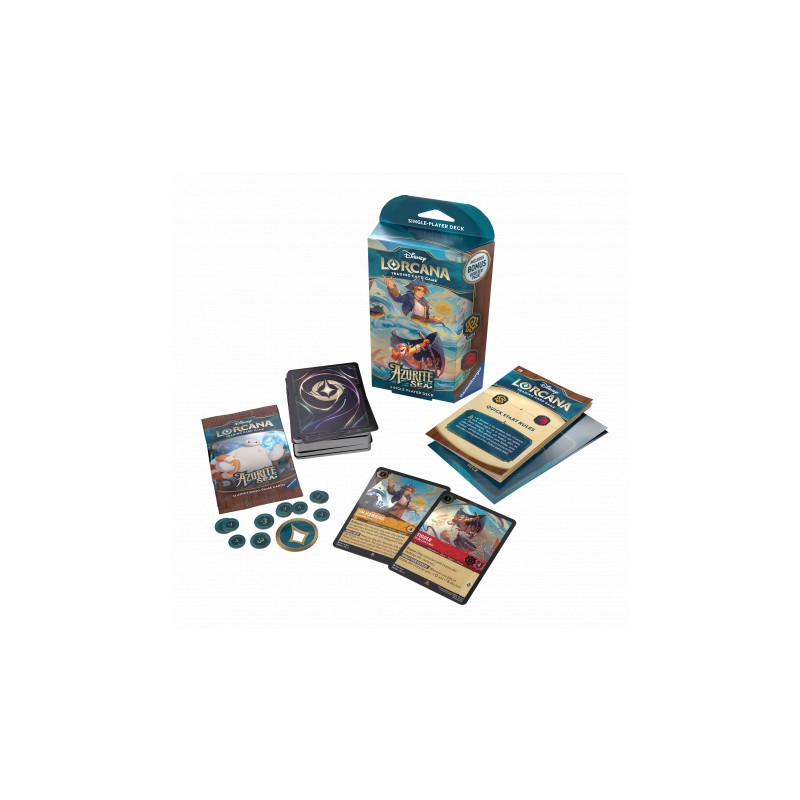 Azurite Sea, Booster, BoxSet your sights on the horizon! Following an ancient map, you'll sail the beautiful yet unpredictable Azurite Sea. Joining you on board, and among this Disney Lorcana set’s 200+ cards, are friends from Big Hero 6 and Chip 'n' Dale: Rescue Rangers! Whether you face kakamora pirates or the whirlpool of a new mystery, your shipmates are ready to head bow-first into adventure.