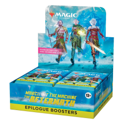 The March of the Machine: The Aftermath Epilogue Booster Box contains 24 March of the Machine: The Aftermath Epilogue Boosters. Each Epilogue Booster contains 5 cards, with a combination of 1–3 card(s) of rarity Rare or higher and 2–4 Uncommon cards. In every pack, a total of 1–2 card(s) of any rarity are Traditional Foil.