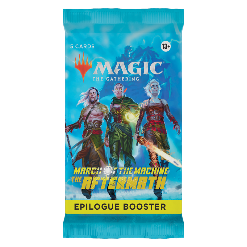 Every March of the Machine: The Aftermath Epilogue Booster contains 5 cards, with a combination of 1–3 card(s) of rarity Rare or higher and 2–4 Uncommon cards. In every pack, a total of 1–2 card(s) of any rarity are Traditional Foil.