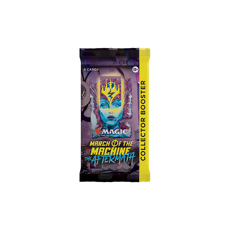 Each March of the Machine: The Aftermath Collector Booster contains 6 Magic: The Gathering cards and 1 Traditional Foil double-sided token, with 4 cards of rarity Rare or higher and 2 Uncommon cards. Every pack contains a total of 5–6 foil cards