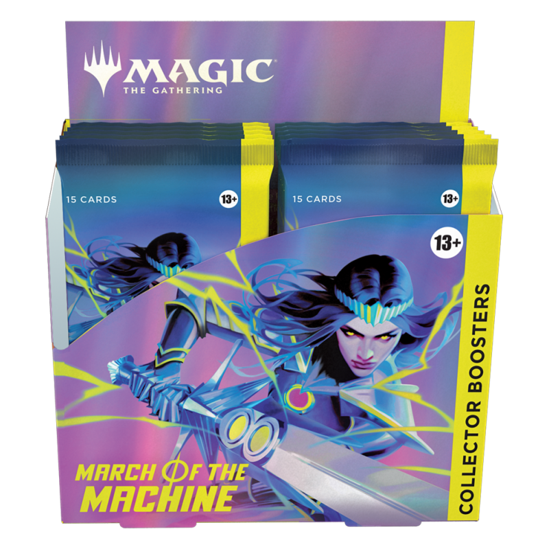 Each March of the Machine Collector Booster contains 15 Magic: The Gathering cards and 1 Traditional Foil double-sided token, with a combination of 5 cards of rarity Rare or higher and 4 Uncommon, 5 Common, and 1 Land cards. Every pack contains a total of 10–12 Traditional Foil cards.