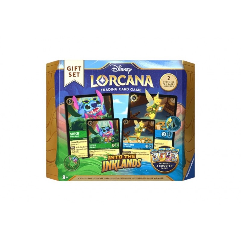The gift set includes 2 collectible oversized foil cards and 2 playable foil game cards in addition to game tokens and 4 randomized booster packs. The Disney Lorcana TCG gift set for Into the Inklands features Stitch – Covert Agent and Tinker Bell – Very Clever Fairy.