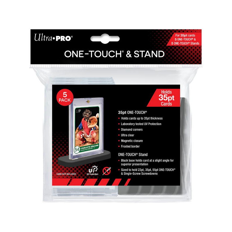 ONE-TOUCH 35pt Stands are a great way to display your favorite trading cards in 23pt, 35pt & 55pt ONE-TOUCH Magnetic Holders. They are also sized to hold Ultra PRO Single-Screw Screwdown. The all black base is designed to hold your favorite collectible card in place at a slight angle for superior presentation.