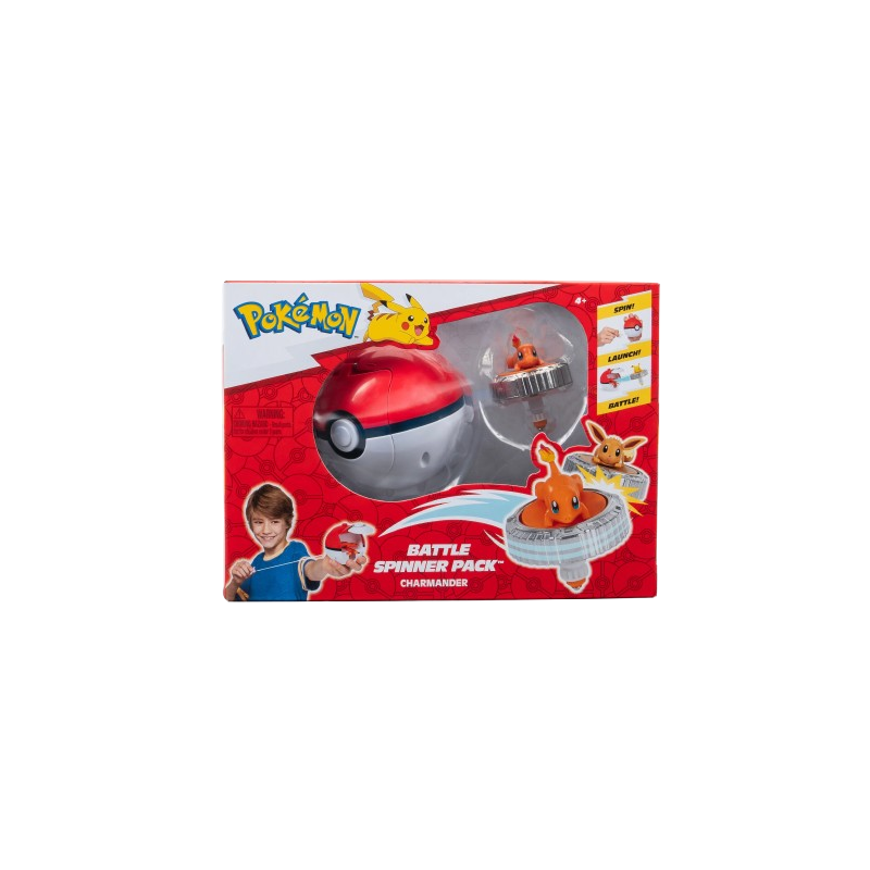 Enfrenta os teus adversários com Pokémon Battle Spinners ! O conjunto inclui um Battle Spinner com Pikachu, Squirtle, Charmander ou Eeve. Carrega os Battle Spinners nos lançadores Poké Ball Spinner e puxa o cabo. Prime o botão superior de cada Poké Ball para lançar os spinners de batalha e entra em ação! Cada spinner apresenta detalhes autênticos e parece ter saído diretamente da tua série Pokémon.